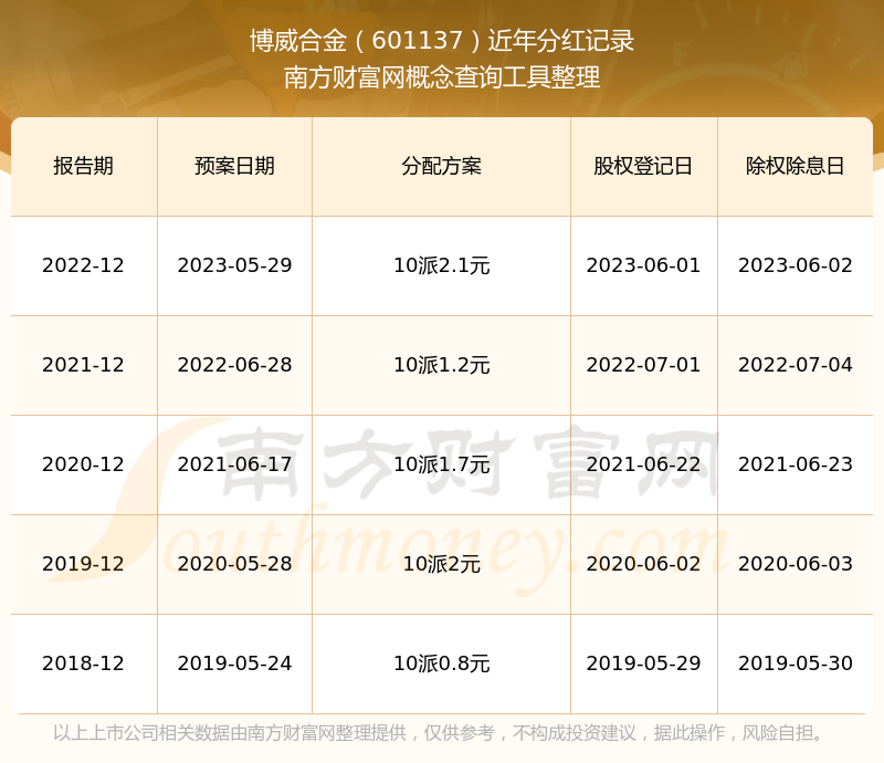 博威合金最新一次公布的分紅方案:10派2.1元。
