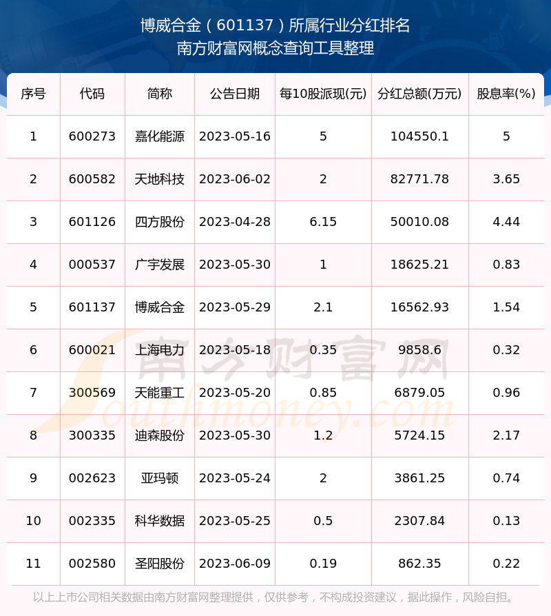按照南方財(cái)富網(wǎng)趨勢選股系統(tǒng)統(tǒng)計(jì),博威合金所屬行業(yè)為新材料行業(yè),新材料行業(yè)分紅排名情況如下表: