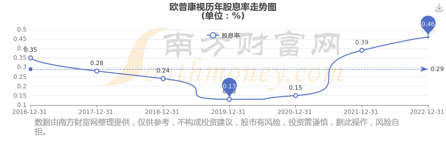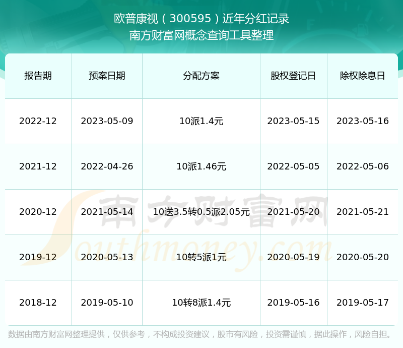 歐普康視最新一次公布的分紅方案為10派1.4元。本次權(quán)益分派股權(quán)登記日為2023年5月15日,除權(quán)除息日為2023年5月16日,派息日為2023年5月16日。