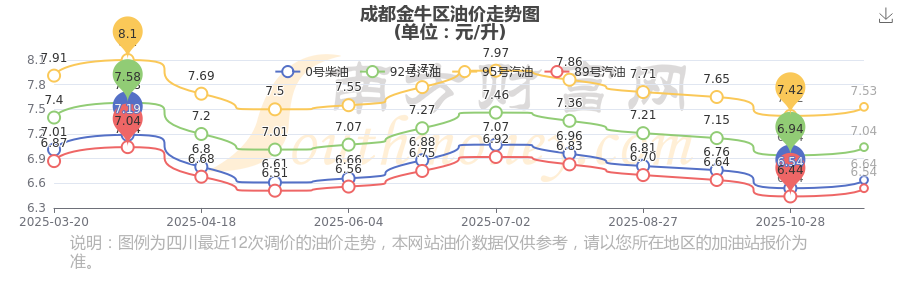 11月12日成都金牛區(qū)汽油、柴油每升的價格是11月11日調(diào)整后的價格:92號汽油為7.04元,上升了0.1元,上升幅達(dá)1.44%;95號汽油為7.53元,上升了0.11元,上升幅達(dá)1.48%;89號汽油為6.54元,上升了0.1元,上升幅達(dá)1.55%;0號柴油為6.64元,上升了0.1元,上升幅達(dá)1.53%。