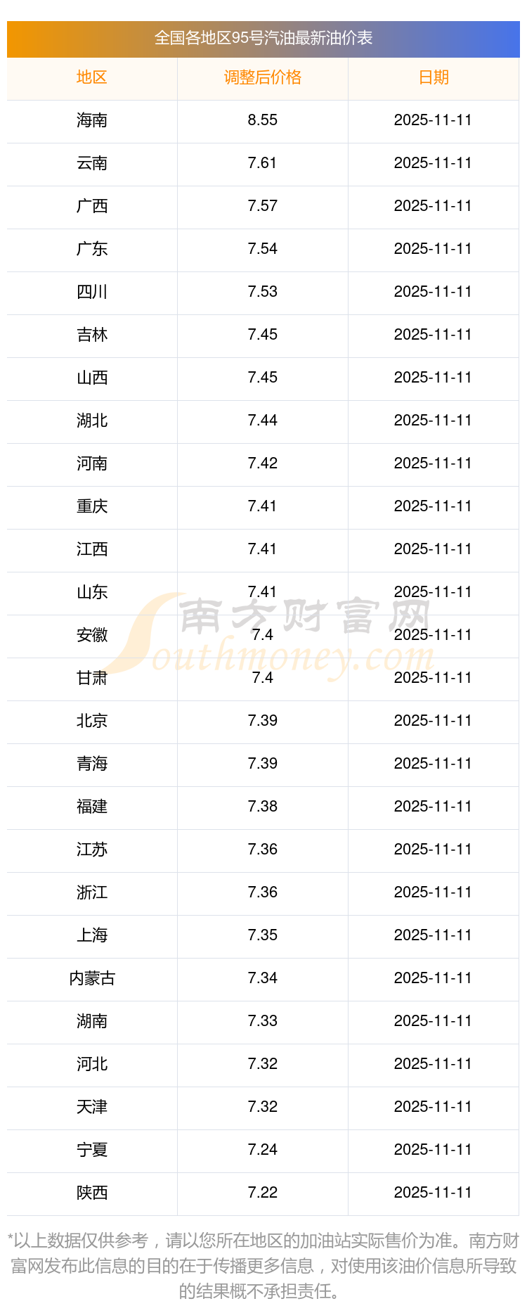 以上數(shù)據(jù)僅供參考,請以您所在地區(qū)的加油站實際售價為準。南方財富網(wǎng)發(fā)布此信息的目的在于傳播更多信息,對使用該油價信息所導致的結果概不承擔責任。
