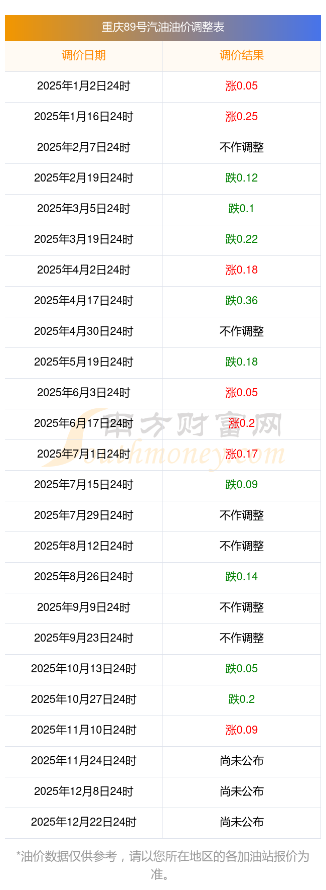 11月12日重慶梁平89號汽油的價格為6.63元/升,本輪油價的調(diào)整時間為11月11日,相對上一輪油價調(diào)整時間10月28日的價格6.54元/升,上升了0.09元,上升幅達1.376%。