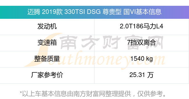 在動(dòng)力上,邁騰 2019款 330TSI DSG 尊貴型 國(guó)VI配備的是一臺(tái)2.0T186馬力L4渦輪增壓發(fā)動(dòng)機(jī),匹配的是7擋雙離合自動(dòng)檔變速箱,燃料形式為汽油,常規(guī)整備質(zhì)量1540kg,廠家參考價(jià)25.31萬(wàn)元。
