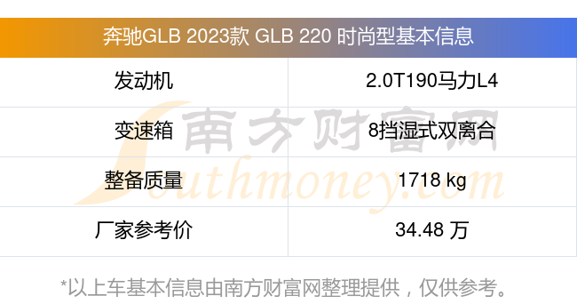 奔馳GLB 2023款 GLB 220 時(shí)尚型動(dòng)力上配備的是一臺(tái)2.0T190馬力L4渦輪增壓發(fā)動(dòng)機(jī),匹配的是8擋濕式雙離合自動(dòng)檔變速箱,燃料形式為汽油,常規(guī)整備質(zhì)量1718kg,廠家參考價(jià)34.48萬(wàn)元。