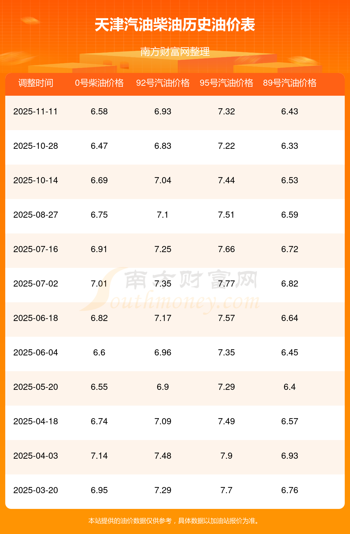天津汽油、柴油11月12日每升的價格為:92號汽油6.93元;95號汽油7.32元;89號汽油6.43元;0號柴油6.58元,本次油價調(diào)整時間是11月11日。
