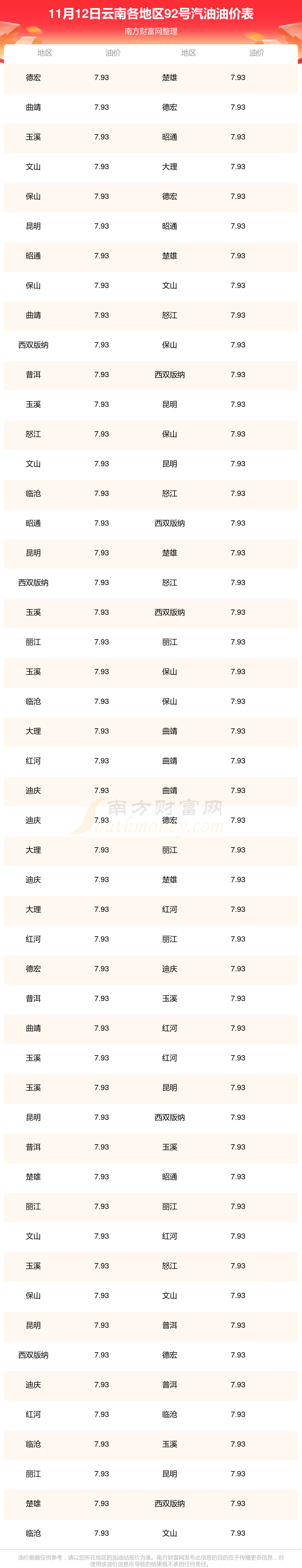 11月12日云南92號汽油的價格是11月11日調整后的價格,為7.09元/升,對比上次調整共增了0.1元,增1.431%。
