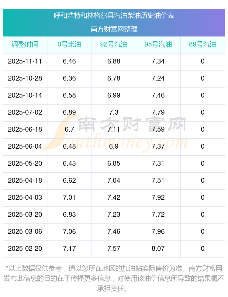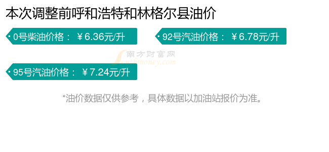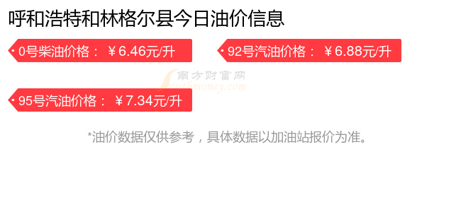 呼和浩特和林格爾縣汽油、柴油11月12日每升的價(jià)格具體是(11月11日調(diào)整后的價(jià)格):92號(hào)汽油6.88元;95號(hào)汽油7.34元;0號(hào)柴油6.46元。