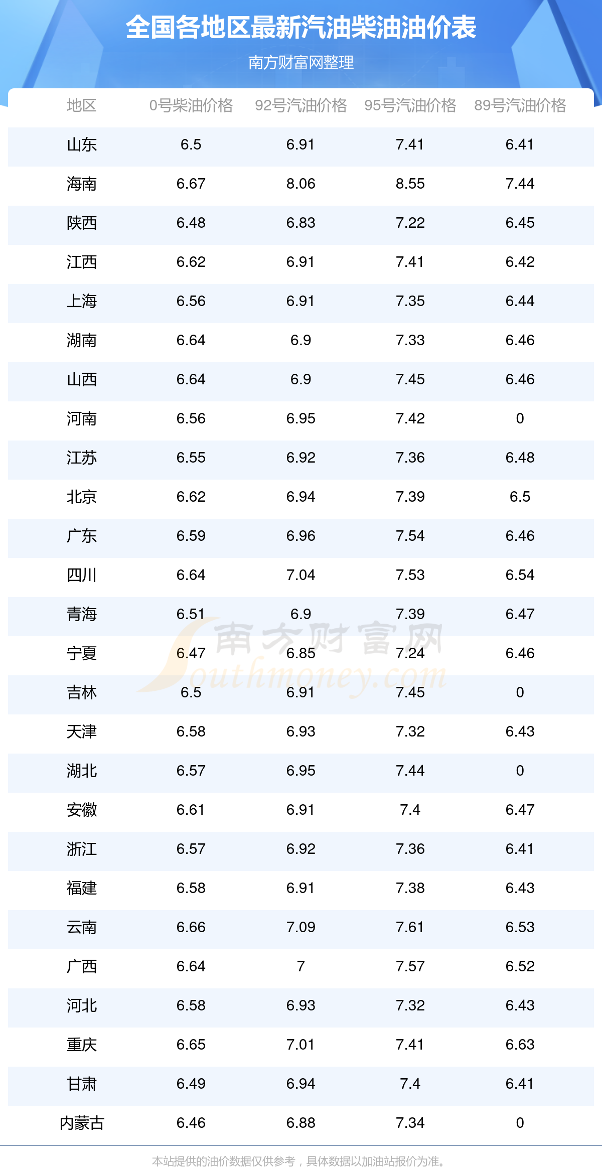 全國95號汽油最新平均價格為:7元每升,其中,最高為海南,價格為8.55元/升,最低為陜西,價格為7.22元/升。