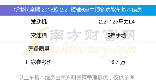 新世代全順 2016款 2.2T短軸6座中頂多功能車搭載了一臺(tái)2.2T125馬力L4渦輪增壓發(fā)動(dòng)機(jī),采用6擋手動(dòng)擋變速箱,廠家參考價(jià)16.7萬元。