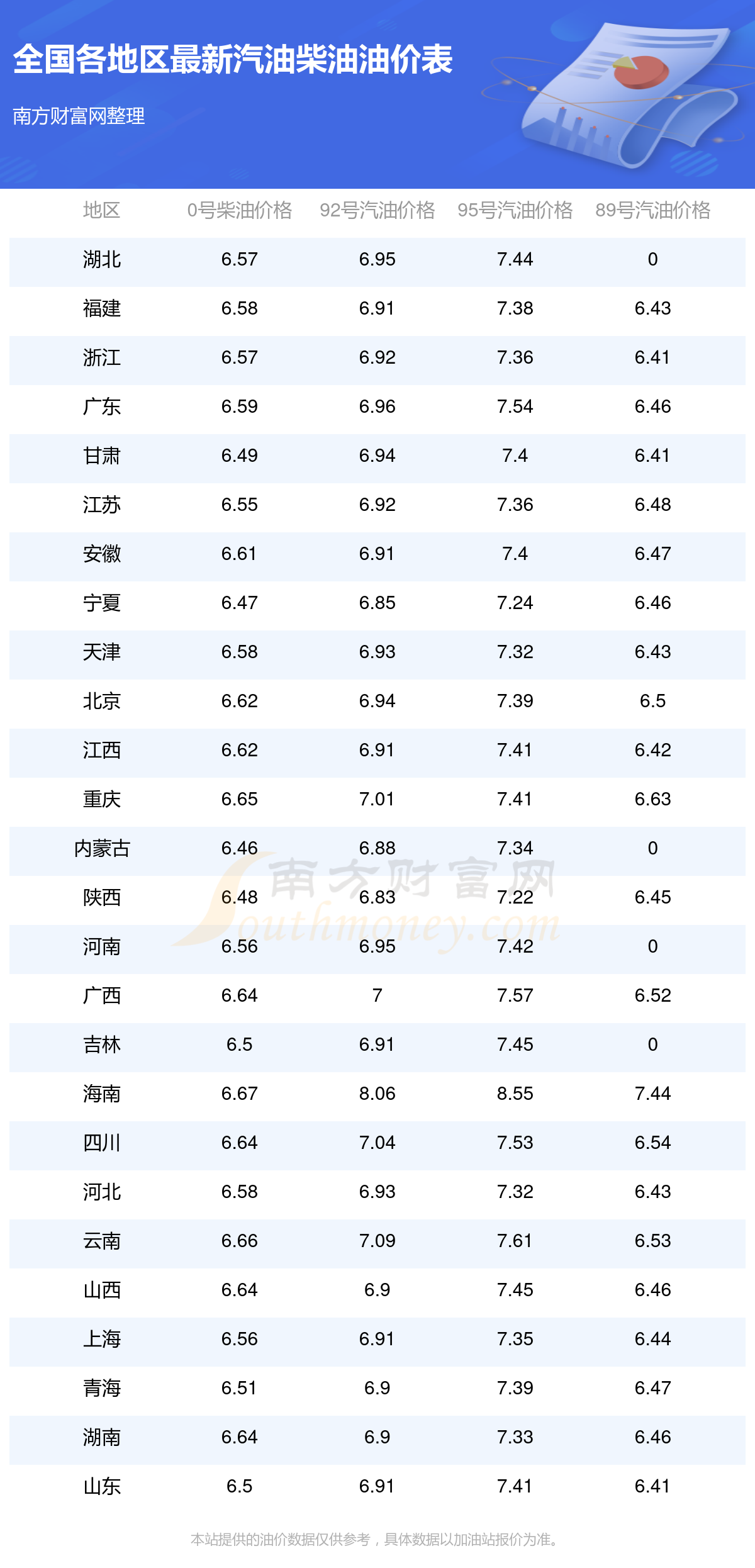 以上數(shù)據(jù)僅供參考,請以您所在地區(qū)的加油站實際售價為準。南方財富網(wǎng)發(fā)布此信息的目的在于傳播更多信息,對使用該油價信息所導致的結(jié)果概不承擔責任。