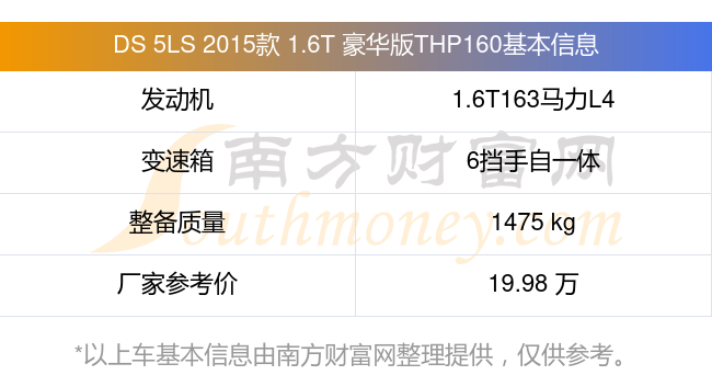 DS 5LS 2015款 1.6T 豪華版THP160動力上搭載的是一臺1.6T163馬力L4渦輪增壓發(fā)動機,匹配6擋手自一體自動檔變速箱,燃料形式為汽油,常規(guī)整備質(zhì)量1475kg,廠家參考價19.98萬元。