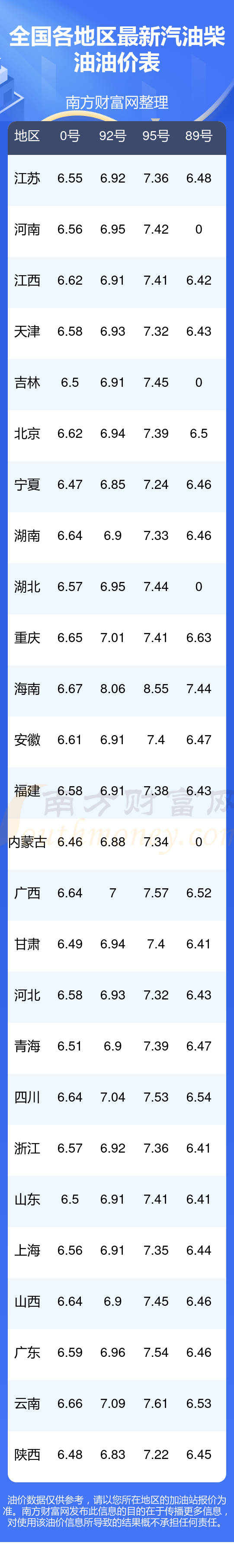 以上數(shù)據(jù)僅供參考,請以您所在地區(qū)的加油站實際售價為準。南方財富網(wǎng)發(fā)布此信息的目的在于傳播更多信息,對使用該油價信息所導致的結(jié)果概不承擔責任。