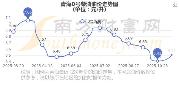 11月12日,青海0號(hào)柴油的價(jià)格是6.51元每升,本次的調(diào)整時(shí)間為11月11日,對(duì)比上次的調(diào)整上升了0.1元,上升1.56%,11月24日24時(shí)為下一輪油價(jià)調(diào)整時(shí)間,還有12.49天。