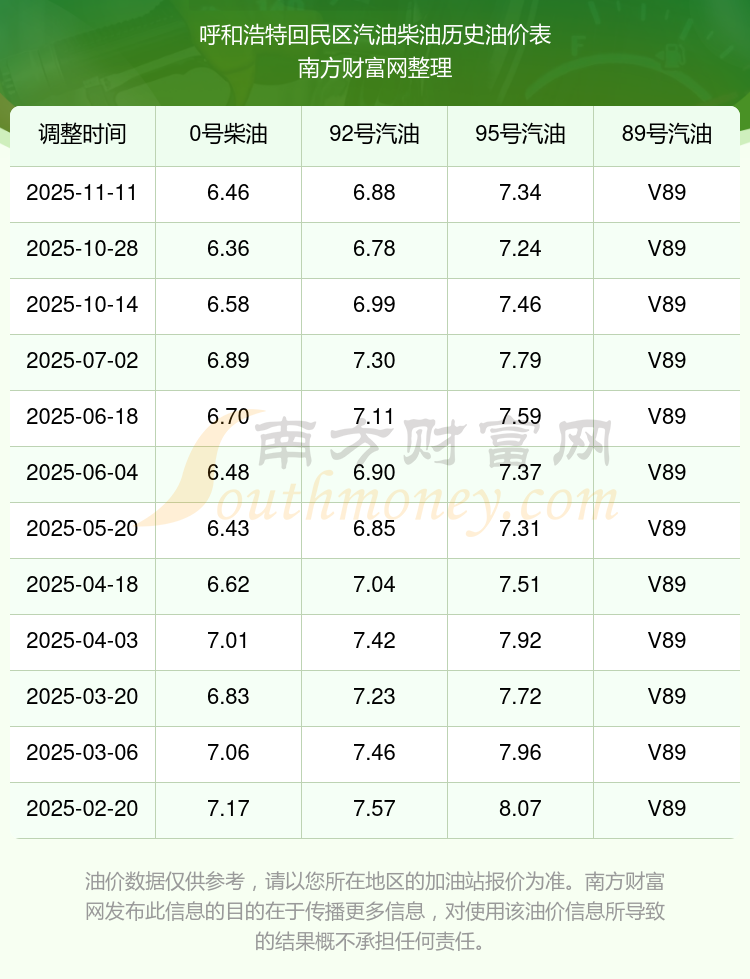呼和浩特回民區(qū)歷史油價(jià)表