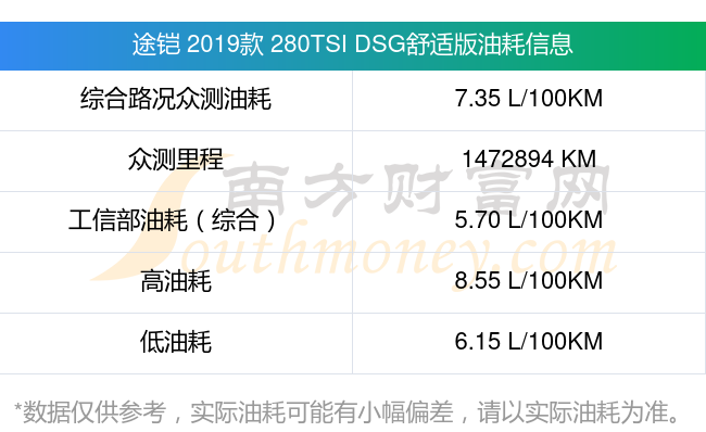 根據(jù)多位車主實(shí)測得出數(shù)據(jù),該車型低油耗為6.15升/百公里,高油耗為8.55升/百公里,綜合路況眾測油耗為7.35升/百公里,工信部綜合油耗為5.70升/百公里。