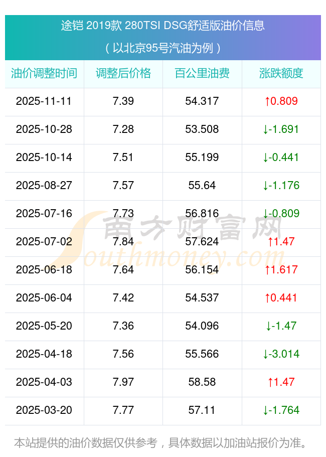 依照11月11日95號(hào)汽油最新調(diào)整價(jià)格7.39元/升來計(jì)算(以北京為例),該車型百公里的平均油費(fèi)是54.317元,依照上一輪10月28日調(diào)整價(jià)格7.28元/升來計(jì)算,百公里的平均油費(fèi)是53.508元,對比上一輪多花0.809元,下一輪的油價(jià)調(diào)整時(shí)間11月24日24時(shí)。