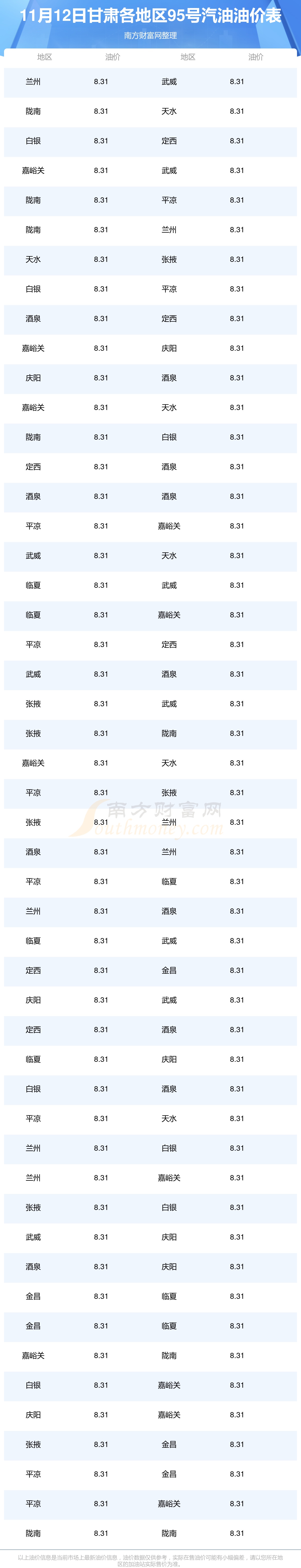 2025年11月12日甘肅95號(hào)汽油最新價(jià)格一覽表
