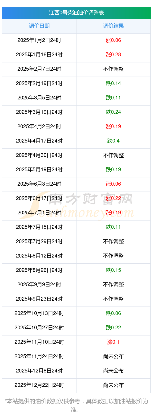 江西0號柴油油價調整表