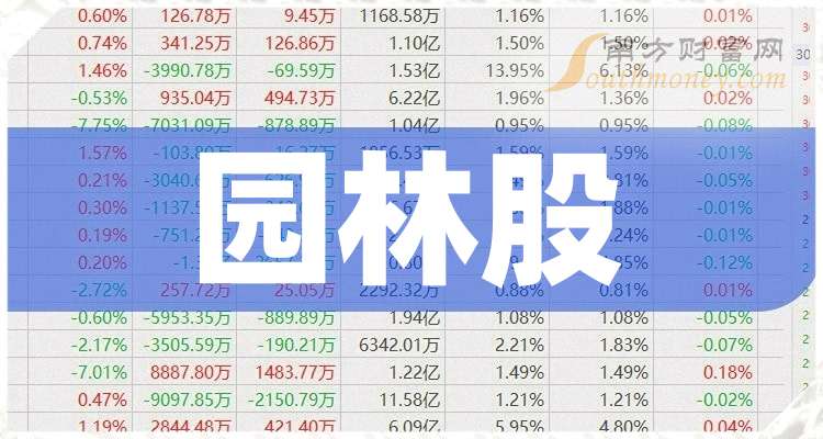 園林股有東方園林、匯綠生態(tài)、國(guó)晟科技、岳陽(yáng)林紙、海南瑞澤、節(jié)能鐵漢、ST京藍(lán)、棕櫚股份、*ST花王、美麗生態(tài)等28家上市公司。