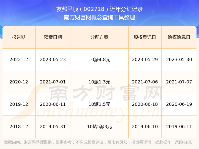 友邦吊頂最新一次公布的分紅方案為10派4.8元。本次權(quán)益分派股權(quán)登記日為2023年5月29日,除權(quán)除息日為2023年5月30日,派息日為2023年5月30日。